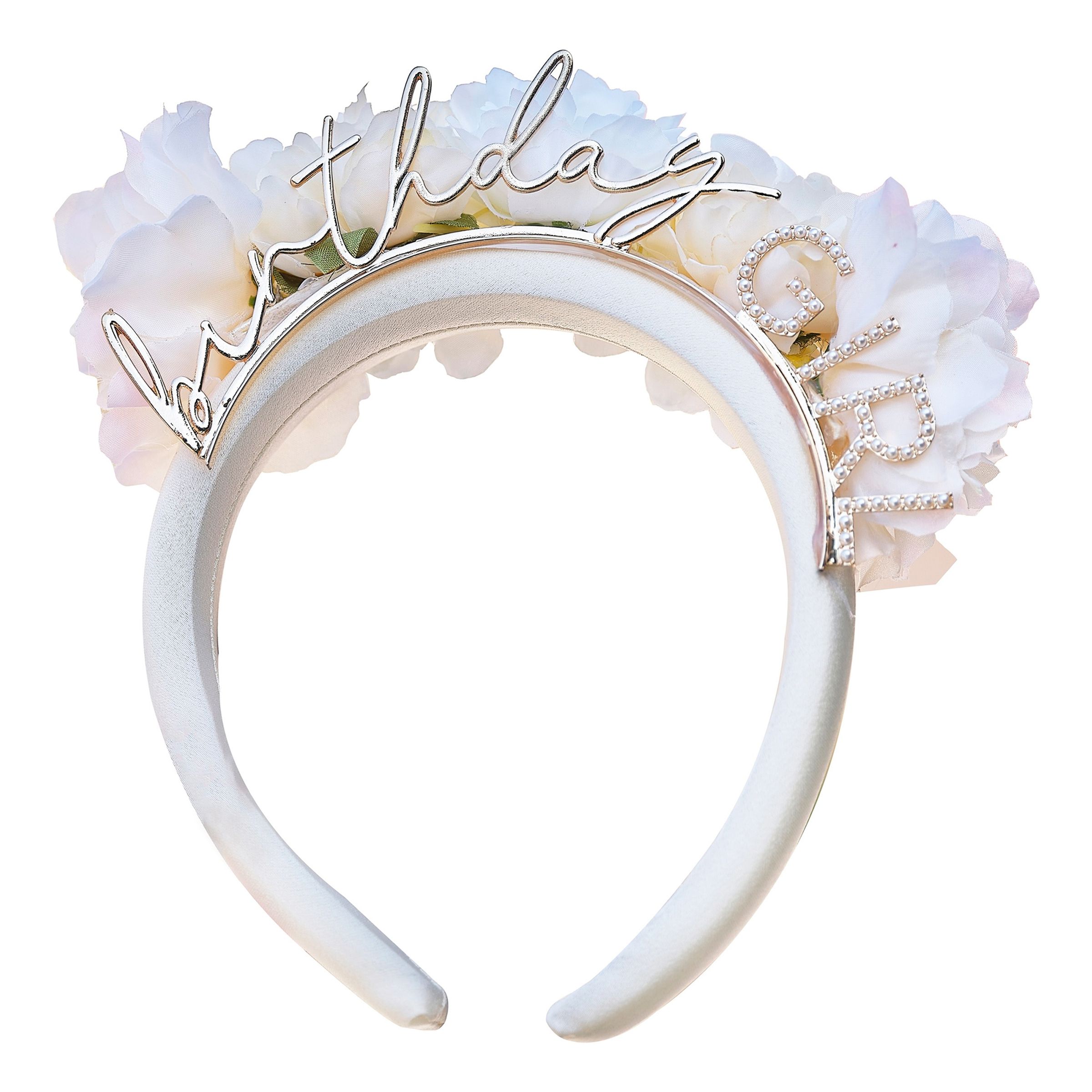 Diadem Birthday Girl med Blommor är ett vitt diadem dekorerad med vita blommor och texten "Birthday Girl" på. Perfekt till överraskningsfesten!