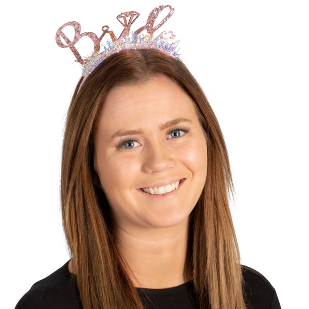 Diadem Blivande Brud omfattar ett ljusrosa diadem med texten "Bride" i glitter.