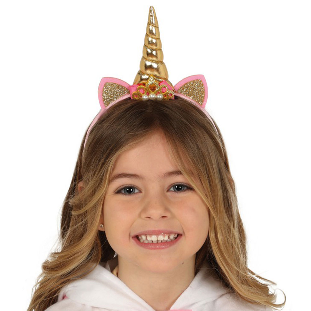 Diadem Guld Enhörning Barn omfattar ett vitt diadem, dekorerat med en rosa rosett, ett guldfärgat enhörningshorn, enhörningsöron i glittrig guld och rosa samt en liten glittrig guldkrona med tre vita pärlor.