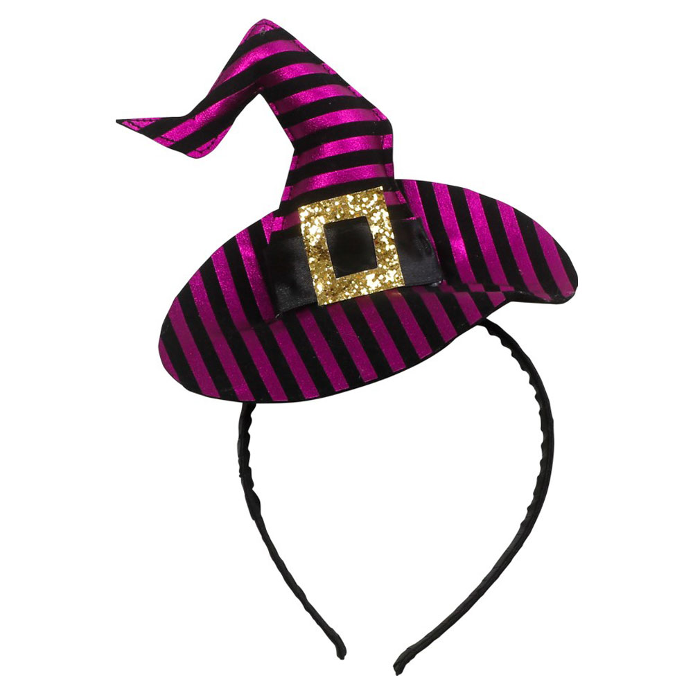 Diadem Häxhatt omfattar ett diadem med en häxhatt, hatten är svart och lila randig.