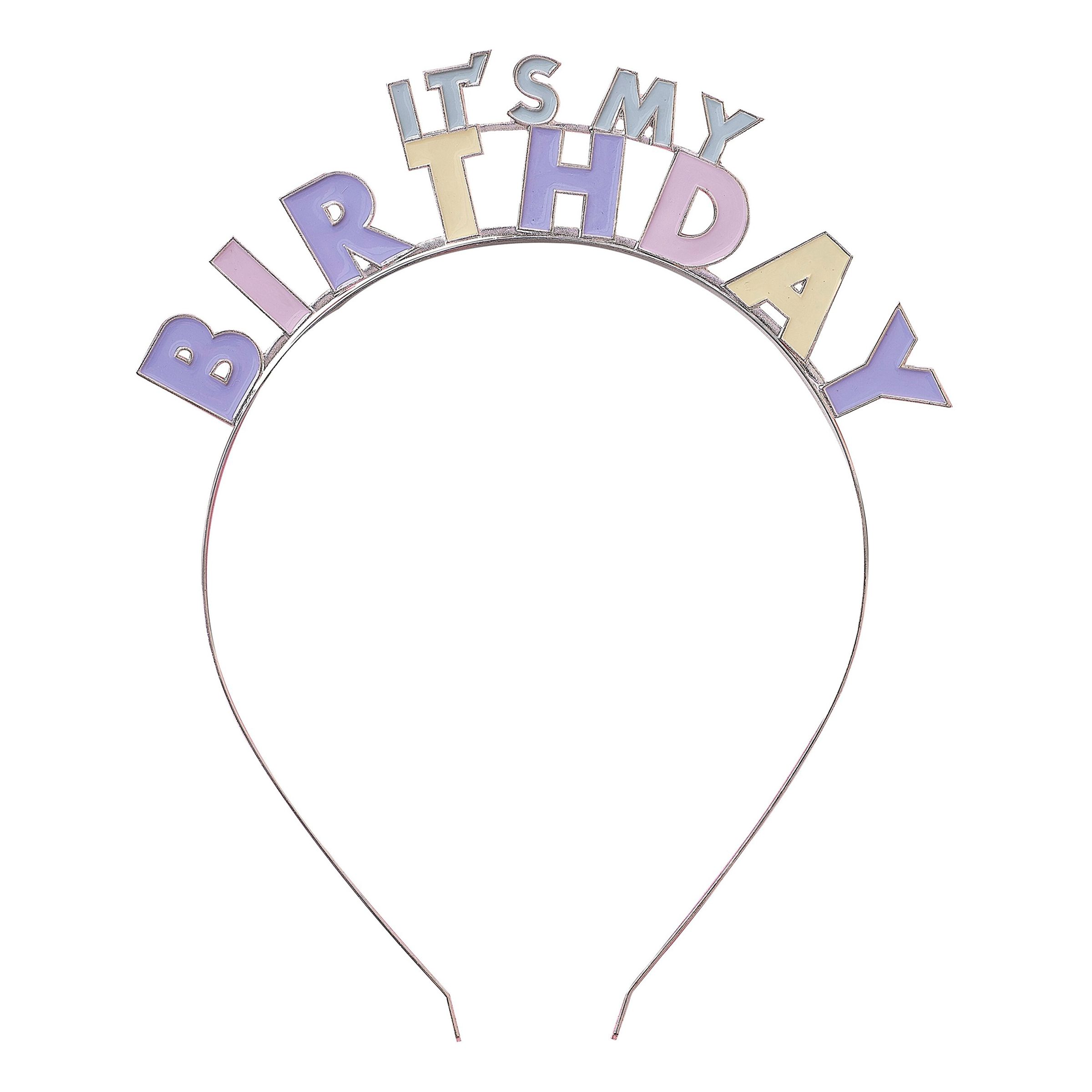 Diadem Its My Birthday i Metall Pastell Wavy inkluderar ett diadem med texten "It's My Birthday" i pastellfärger. Den givna presenten att ge till födelsedagsbarnet, eller att bära på din egna födelsedagsfest!
