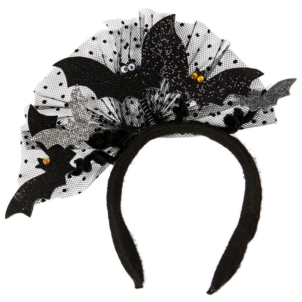 Diadem med Fladdermöss omfattar ett diadem med glittriga svarta och silvriga fladdermöss som flyger. Diademet har även ett svart nättyg med små svarta prickar.