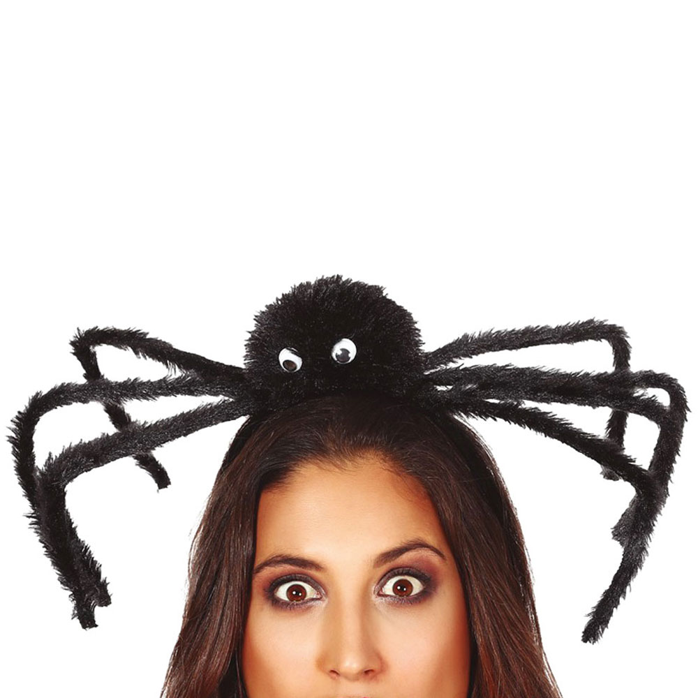 Diadem med Fluffig Spindel omfattar ett svart diadem med mjukt överdrag och en stor rund, fluffig och hårig spindel med ögon och åtta långa och böjbara ben. Diademet är tillverkat i plast och polyester och passar vuxna.