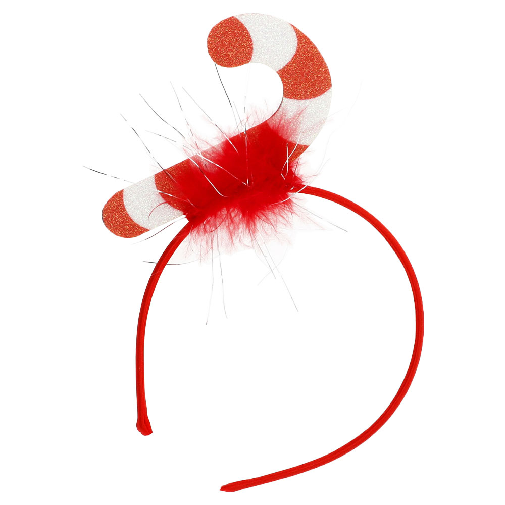 Diadem med Polkagris omfattar ett rött diadem med en glittrig randig polkagris och lite glitter och fluff. Juldiademet är böjbart och i plast och passar både barn och vuxna.