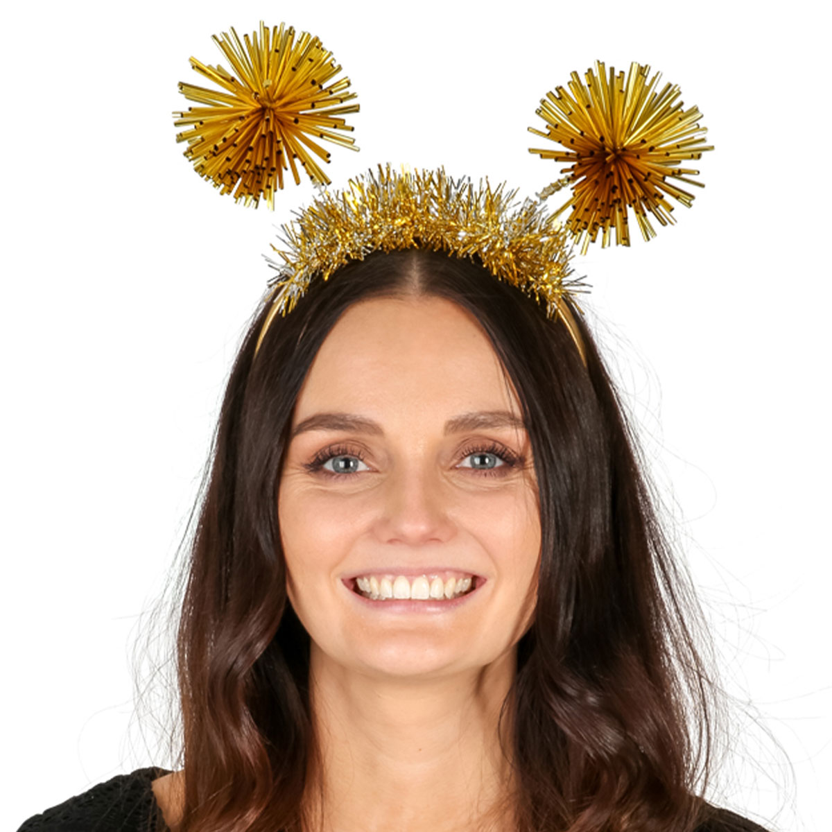 Diadem med Pom Poms Guld omfattar ett guldfärgat diadem med två utstickande pom poms.