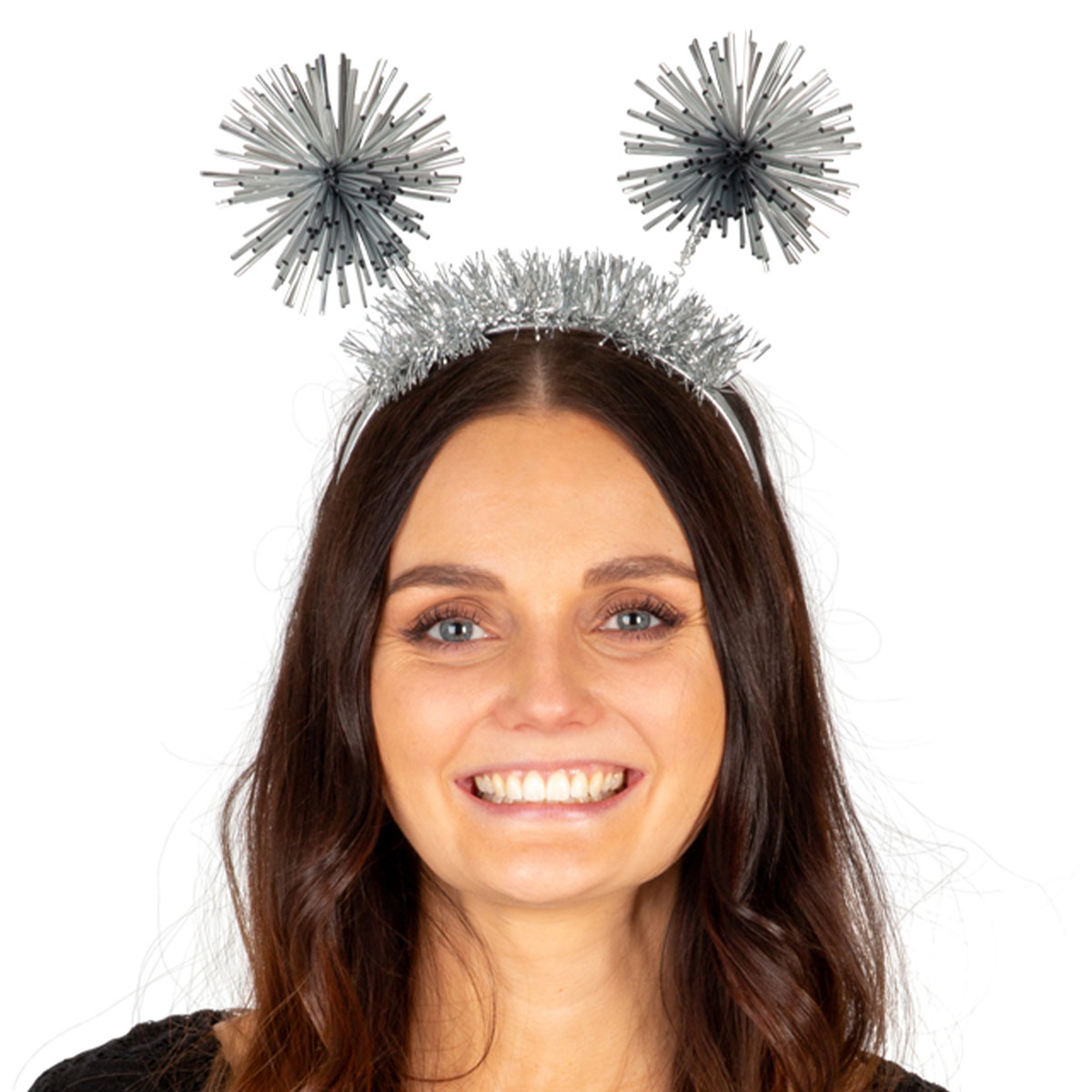 Diadem med Pom Poms Silver omfattar ett silverfärgat diadem med två utstickande pom poms.