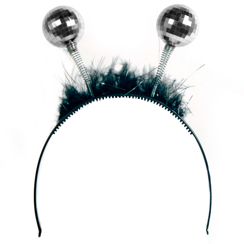 Diadem med Silver Discobollar består av ett svart diadem med svart/silver fluff och ett par skimrande discobollar i matchande design. De silverfärgade discobollarna sitter fast på vardera fjäder för en rolig effekt.