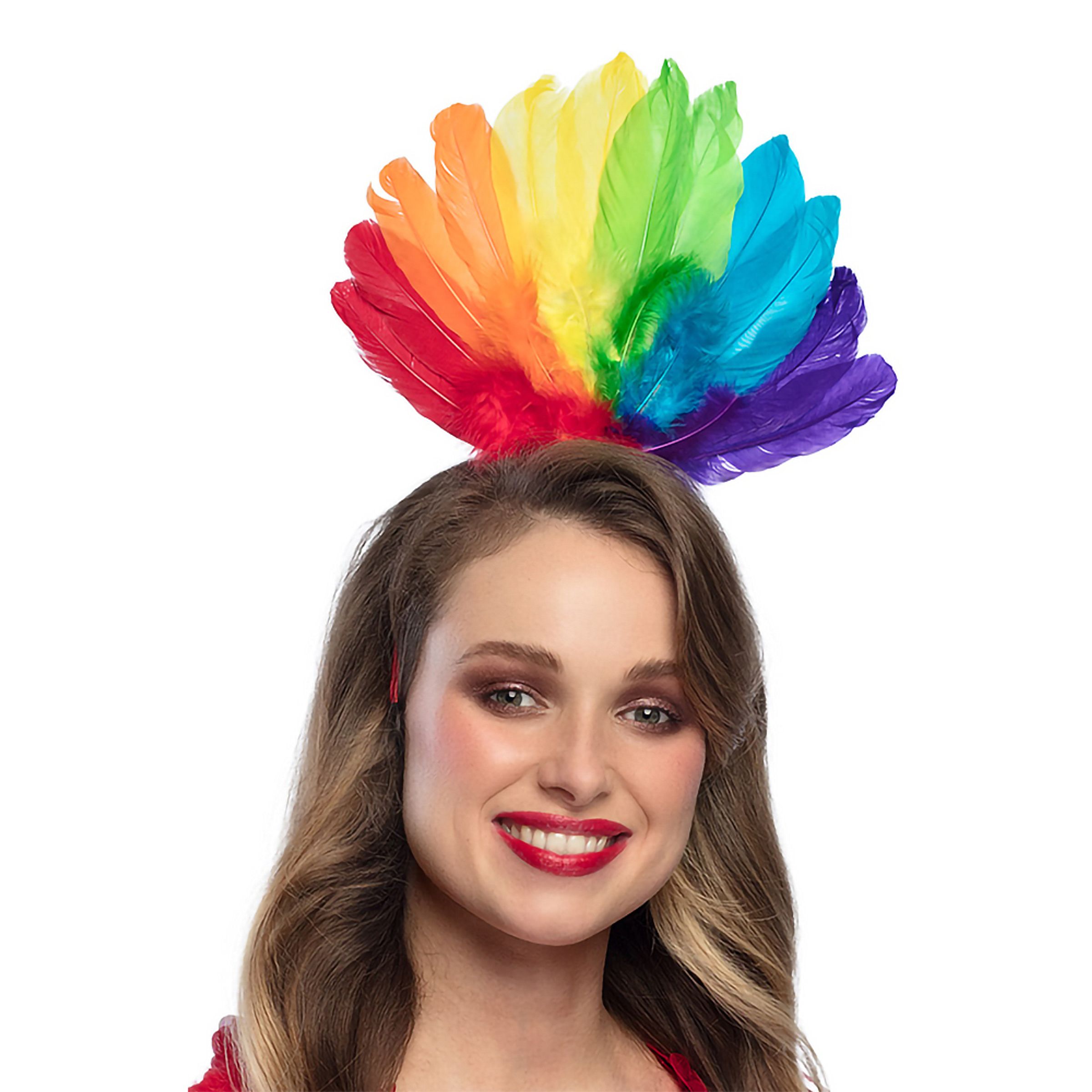 Diadem Pride kommer fullproppad med uppstickande fjädrar i regnbågens alla färger. Diademet sitter även säkrad på huvudet med hjälp av ett elastiskt resårband.