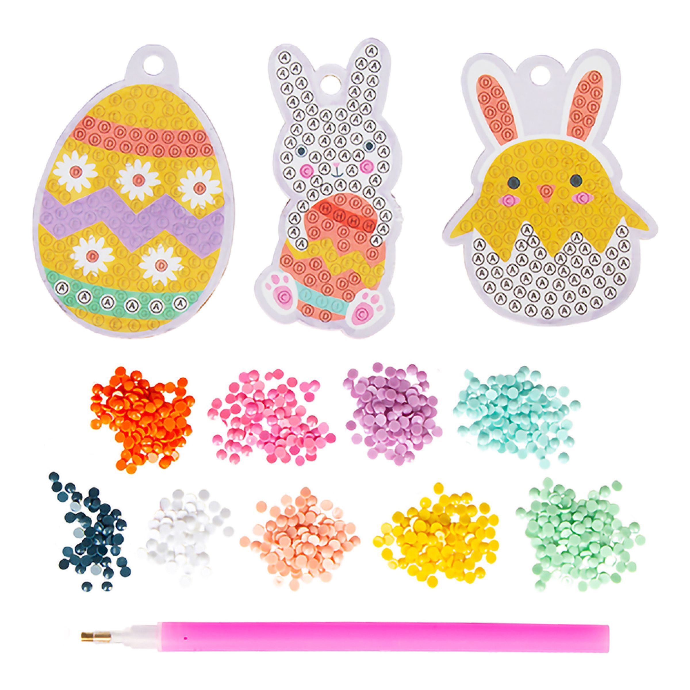 Diamond Painting Påsk Pysselkit är ett kit där du finner allt för att göra tre stycken fina påsk ikoner för att hänga upp i påskriset.