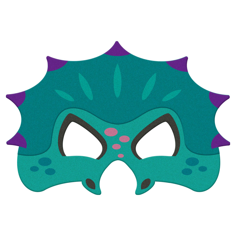 Dinosauriemask Barn omfattar en blå dinosauriemask för barn. Masken hålls på plats med ett elastiskt band och har hål för ögonen. Den är tillverkad av mjukt filtmaterial och är ca 15 cm hög samt 22 cm bred.