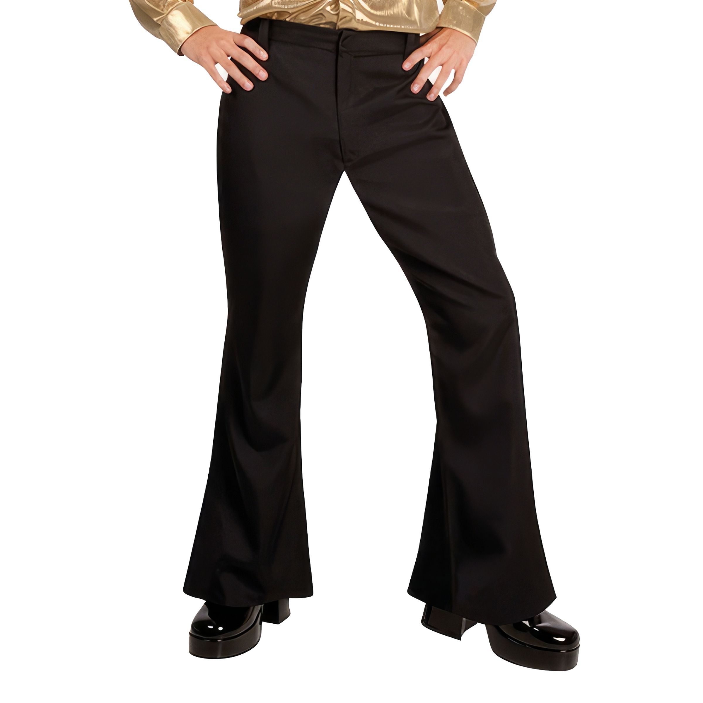 Discobyxor Svarta är ett par klassiska svarta 70-talsbyxor i utsvängd modell och hög midja. Visa dina Travolta-moves på nästa temafest och låt discodivan inom dig vakna till liv ännu en gång. Skor och skjorta ingår ej. Byxorna har en resår på baksidan av linningen som gör att de sitter åt ordentligt trots att de är i one size.