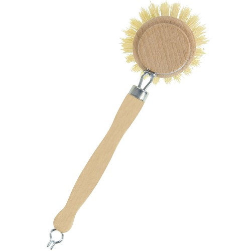 Plastbanta bort diskborsten i plast och ersätt med en diskborste i trä! Denna trädiskborste är försedd med naturborst, metalldetaljer och en krok på skaftet för praktisk upphängning.