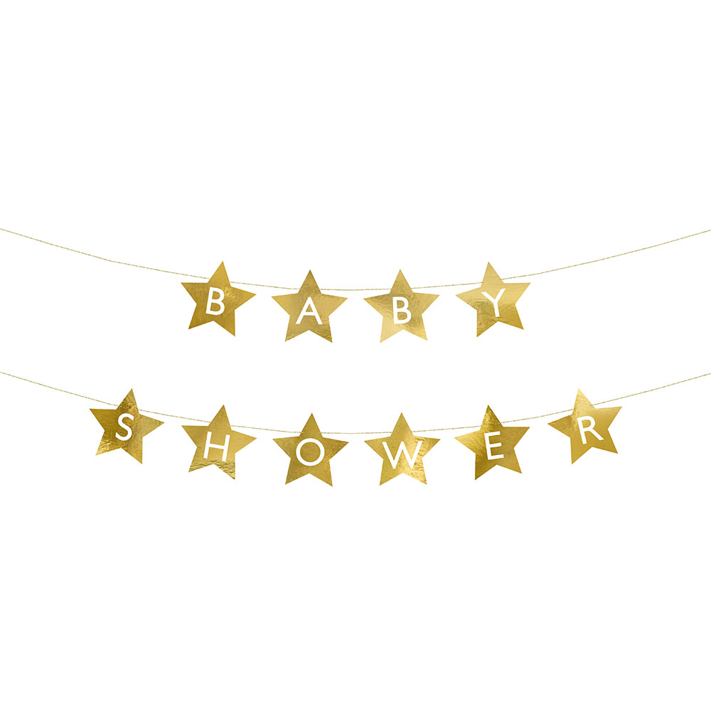 DIY Girlang Babyshower Guld är en girlang med guldstjärnor med bokstäver i vitt som bokstaverar "Baby Shower". Girlangen går att ha som en lång girlang eller uppdelad till två.
