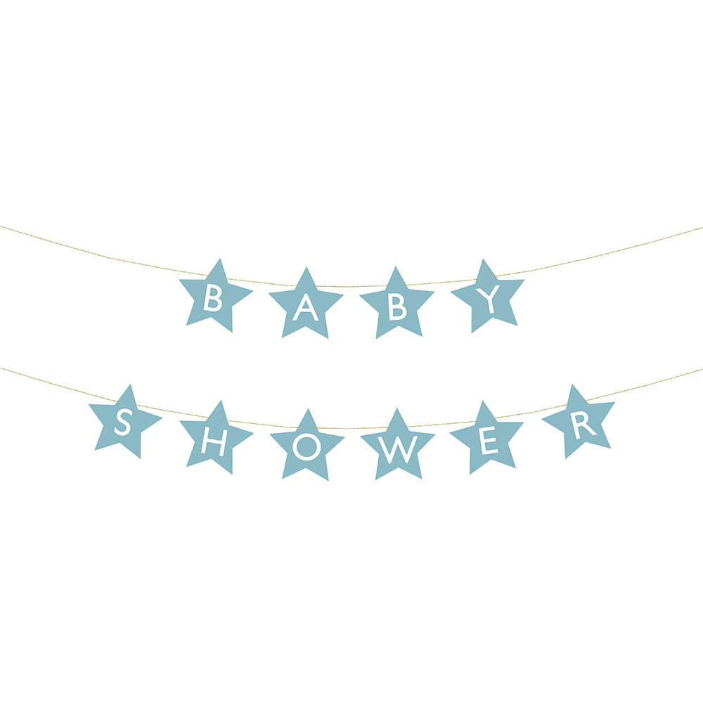 DIY Girlang Babyshower Ljusblå är en girlang med ljusblå stjärnor med bokstäver i vitt som bokstaverar "Baby Shower". Girlangen går att ha som en lång girlang eller uppdelad till två.