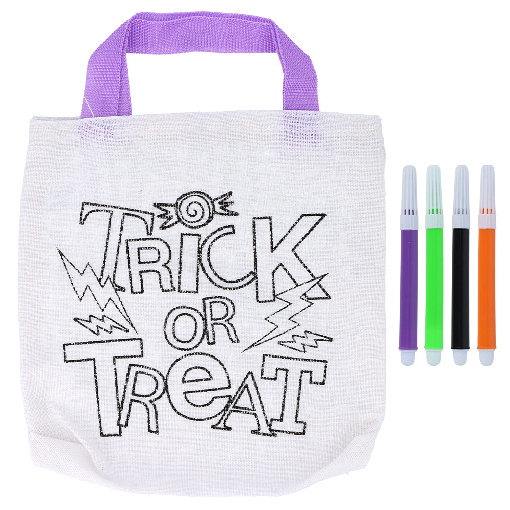 Låt barnen färglägga sin egen tygpåse med tryck i Halloween-tema! Denna DIY tygpåse kommer med fyra färgglada textilpennor. Skapa unika mönster tillsammans och njut av höstens skräck festligheter med denna kreativa aktivitet.