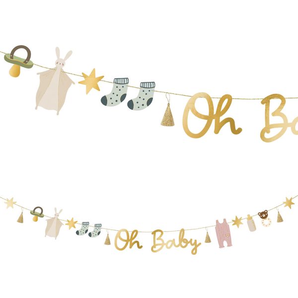 DIY Oh Baby Girlang är en girlang bestående av ett guldsnöre, text i guld som bokstaverar "Oh Baby" samt flera dekorationer med barnmotiv som kan placeras långst girlangen som önskat.