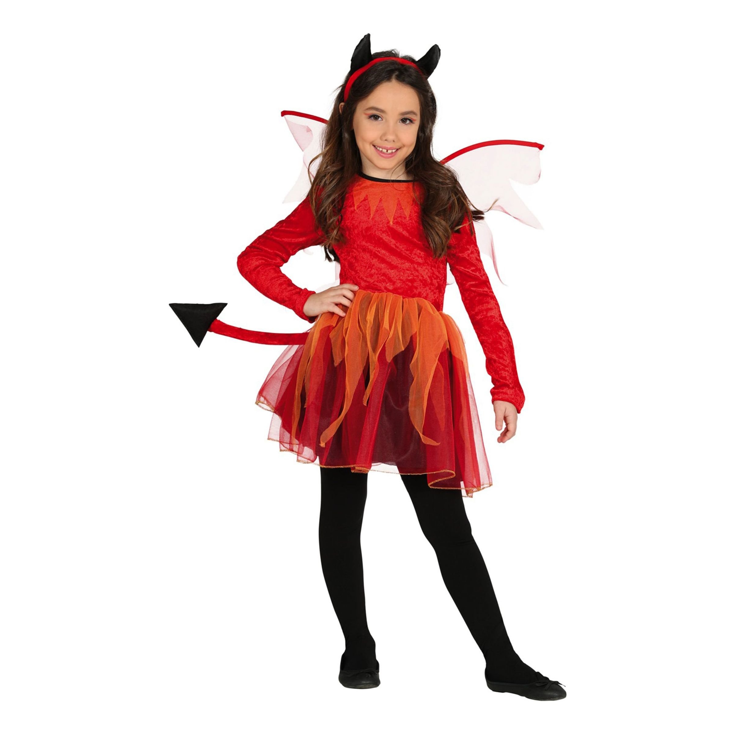Djävul Klänning Barn Maskeraddräkt inkluderar en röd klänning med en överdel i sammet och tyllkjol. På baksidan sitter det en djävulssvans och på ryggen sitter det ett par vingar. Det ingår även ett diadem med svarta djävulshorn.