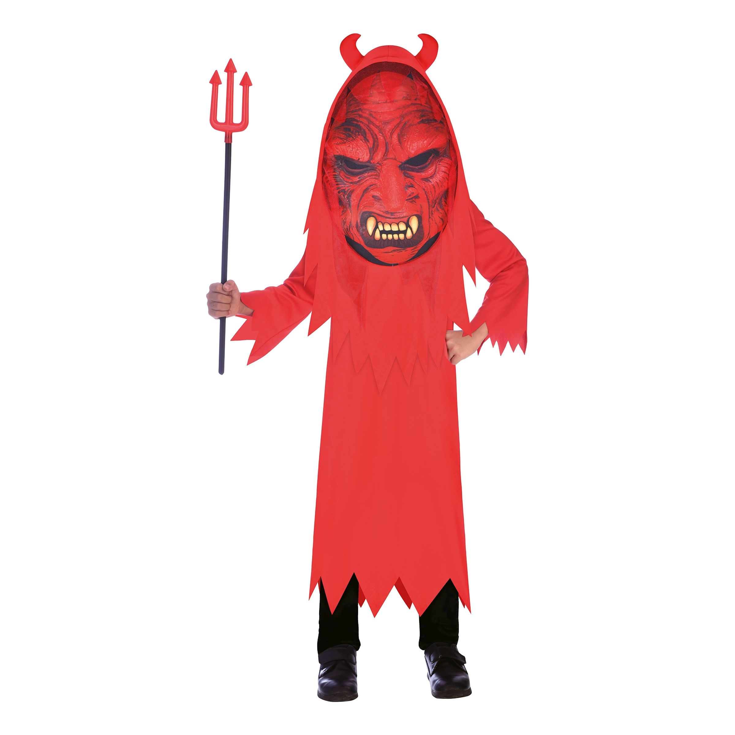 Djävul med Stort Huvud Barn Maskeraddräkt inkluderar en röd dräkt med huva och en överdimensionerad mask som täcker hela huvudet och har två djävulshorn. En perfekt dräkt att bära på halloweenfesten!