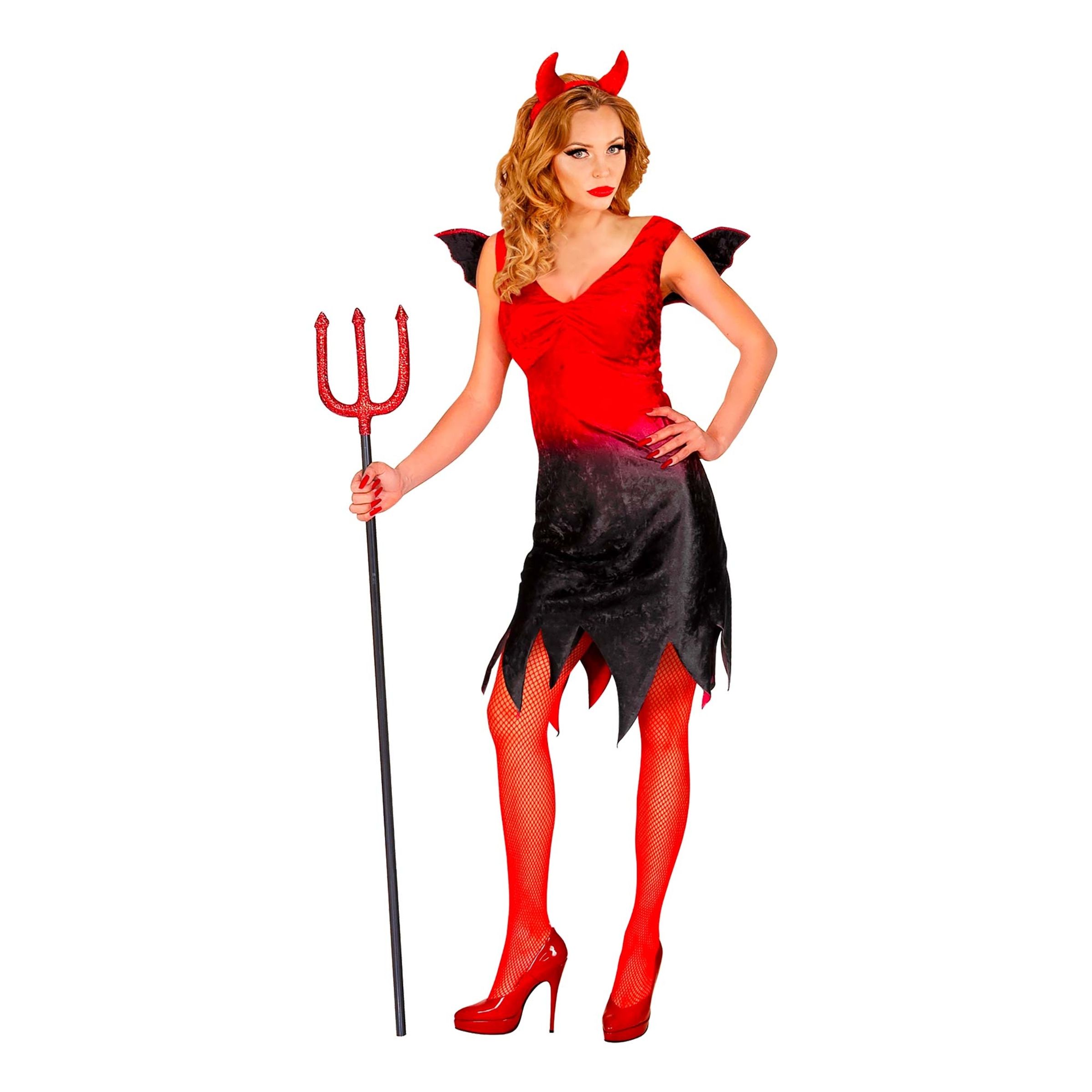 Djävul Svart/Röd Klänning Maskeraddräkt inkluderar en röd och svart klänning med korta ärmar, ett par vingar samt ett par röda horn som sitter på ett diadem. Komplettera gärna med en djävuls treudd!