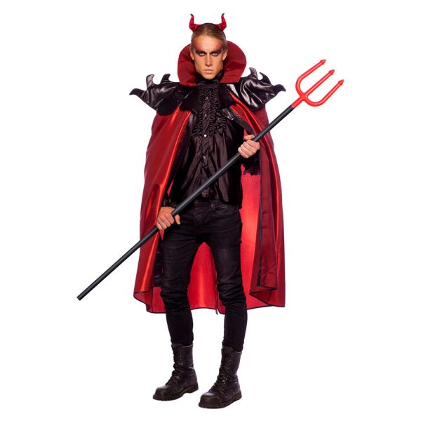 Djävuls Cape och Horn Set Deluxe omfattar ett rött djävulsdiadem med horn och en lång, röd mantel med hög krage och svarta detaljer. Tillbehören är tillverkade av polyester och passar vuxna.