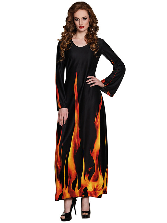Djävulsklänning med Flames innefattar en långärmad lång svart klänning med orangea flammor som vidliknar eld på.