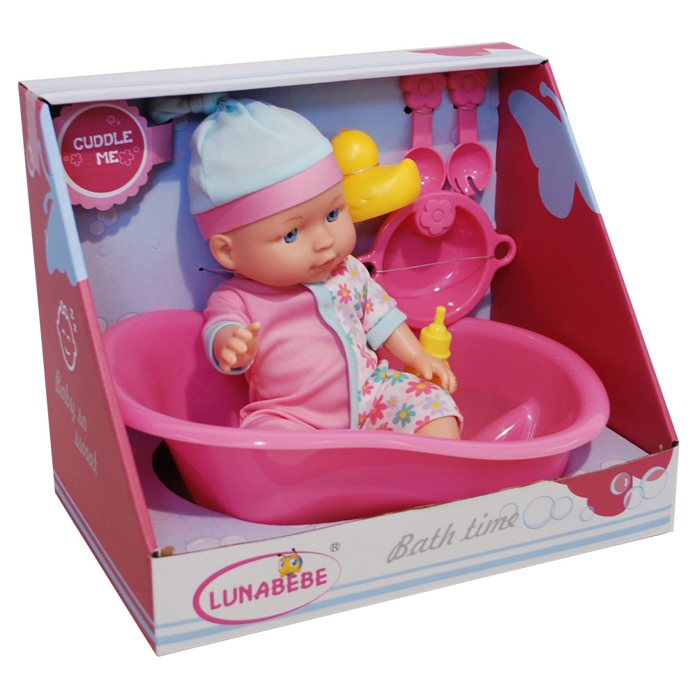 Docka med Badkar Lunabebe omfattar en söt bebisdocka med badkar, badanka, nappflaska och en tallrik med bestick. Dockan är ca 29 cm stor och lämpar sig till barn på 3 år och uppåt. Tillverkad av plast.