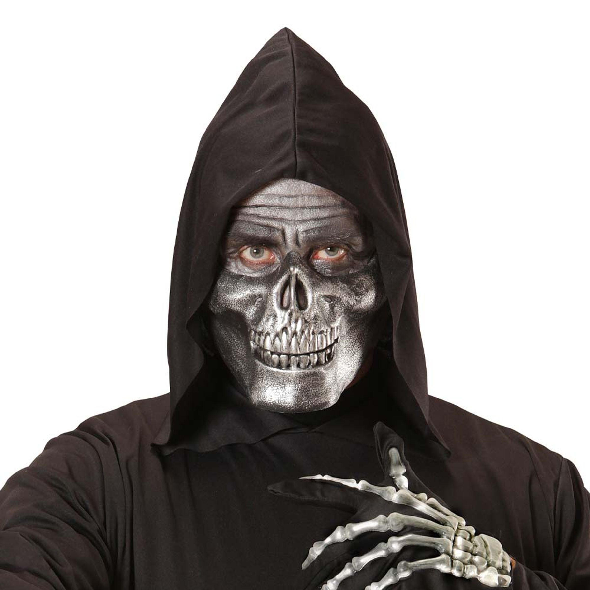 Dödskalle Halvmask Silver är en häftig silverfärgad döskalle-halvmask. Masken har andningshål och täcker ditt ansikte upp till området under ögonen. Köp till matchande hudfärg för att få den look som på bilden!