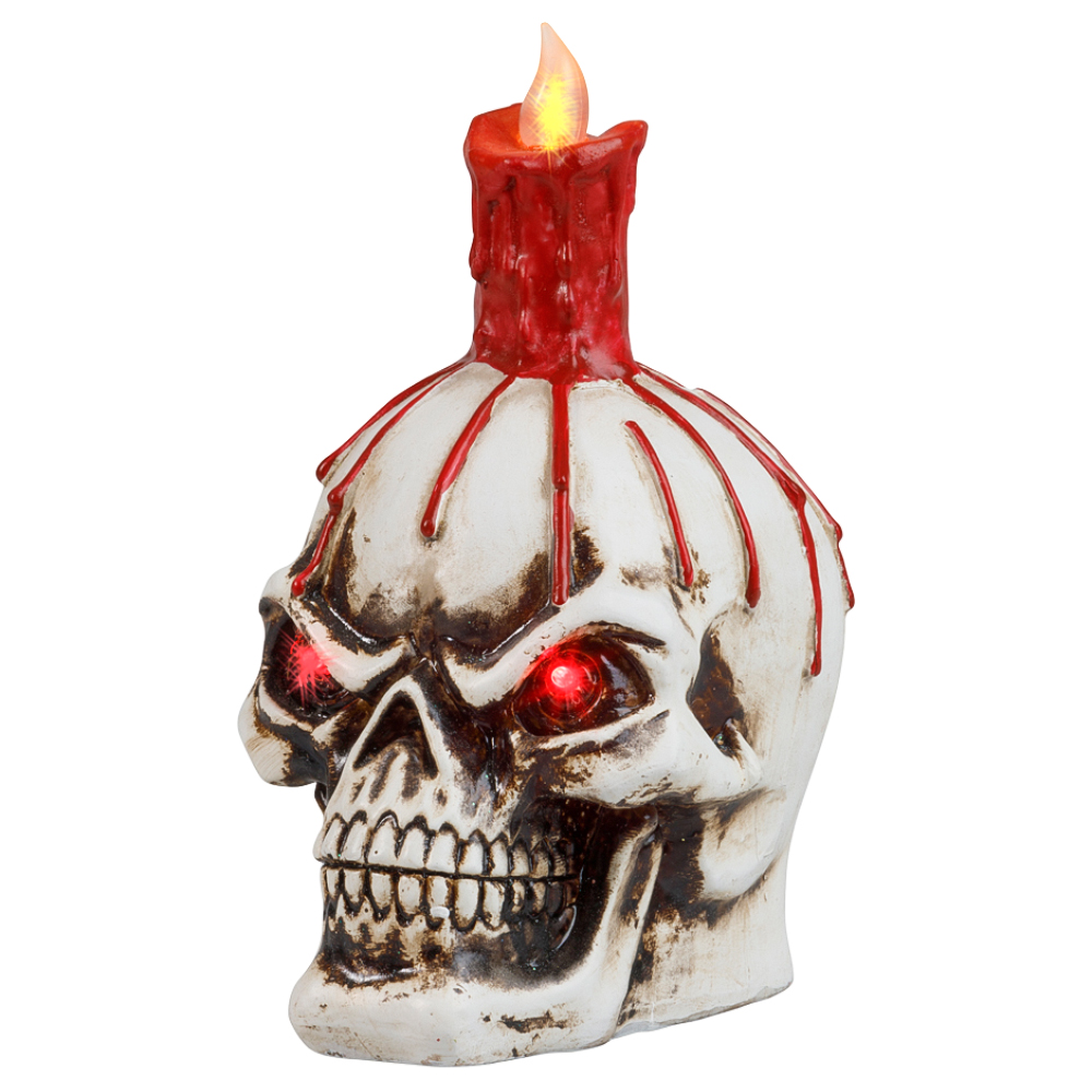 Cool och läskigt dödskalle ljus med röd och gul LED belysning, en häftig ljus lampa, prydnad och Halloween-dekoration för årets Halloween fest och maskerad. Ett döskalle ljus trivs i kusligt mörker och blir garanterat uppskattat av alla kusliga gäster, en utmärkt dekoration och Halloween-prydnad, ett Halloween-pynt att räkna med.