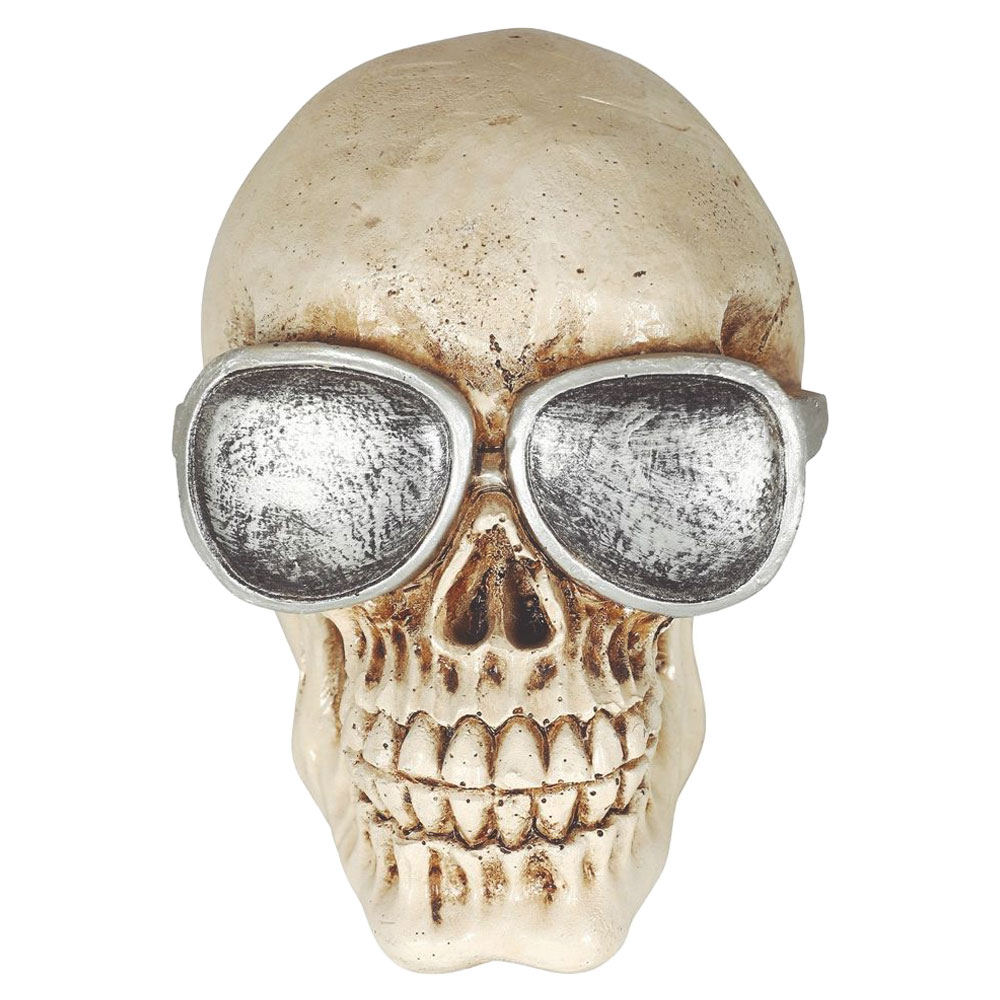 Dödskalle med Solglasögon Dekoration omfattar en prydnad och dekoration i form av en dödskalle med silvriga solglasögon. Dödskallen är tillverkad i polyresin och är ca 8 cm hög, 7 cm bred och 9,5 cm lång.