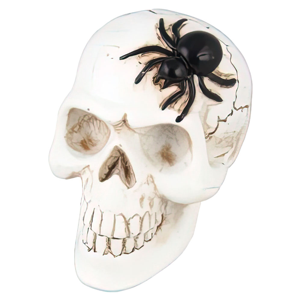 Dödskalle Mini omfattar en vit dödskalle i litet format med en svart spindel på huvudet. Säljs styckvis.