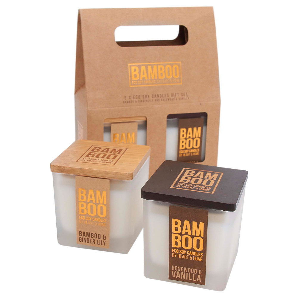 Doftljus Set består av en presentask innehållande två levande ljus, varav det ena doftar bambu och doftviska och det andra doftar rosenträ och vanilj. Ljusen står i frostad glasburk med lock av bambu som kan användas som ljusunderlägg. Ljusen är ekologiska och miljövänliga.