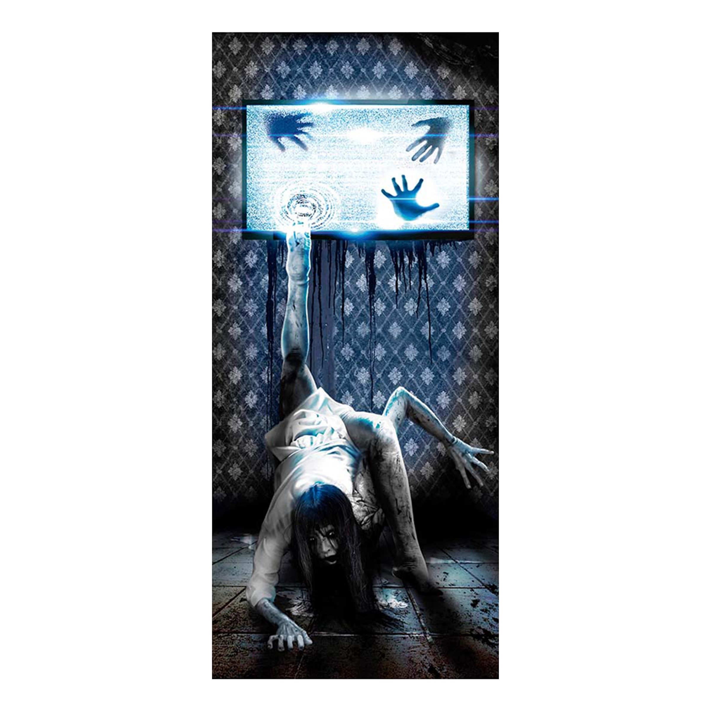 Spela ett elakt spratt på brorsan eller kompisen genom att fästa den här sjukt läskiga dekorationen på deras sovrumsdörr. När de smäller igen den så kommer de mötas av en övervig flicka som är påväg ut ur TV:n. Vi lovar att ett och annat skrik av skräck kommer höras.