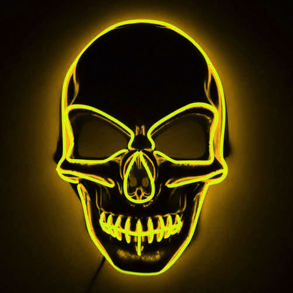 Döskalle LED-Mask Gul omfattar en vit döskalle mask av plast med svarta detaljer och gul LED-belysning. Masken har hål för ögonen, hålls på plats med hjälp av ett justerbar elastiskt band samt drivs av 2 x AA-batterier.