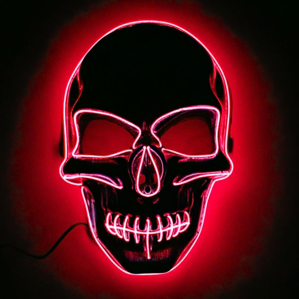 Döskalle LED-Mask Röd omfattar en vit döskalle mask av plast med svarta detaljer och röd LED-belysning. Masken har hål för ögonen, hålls på plats med hjälp av ett justerbar elastiskt band samt drivs av 2 x AA-batterier.