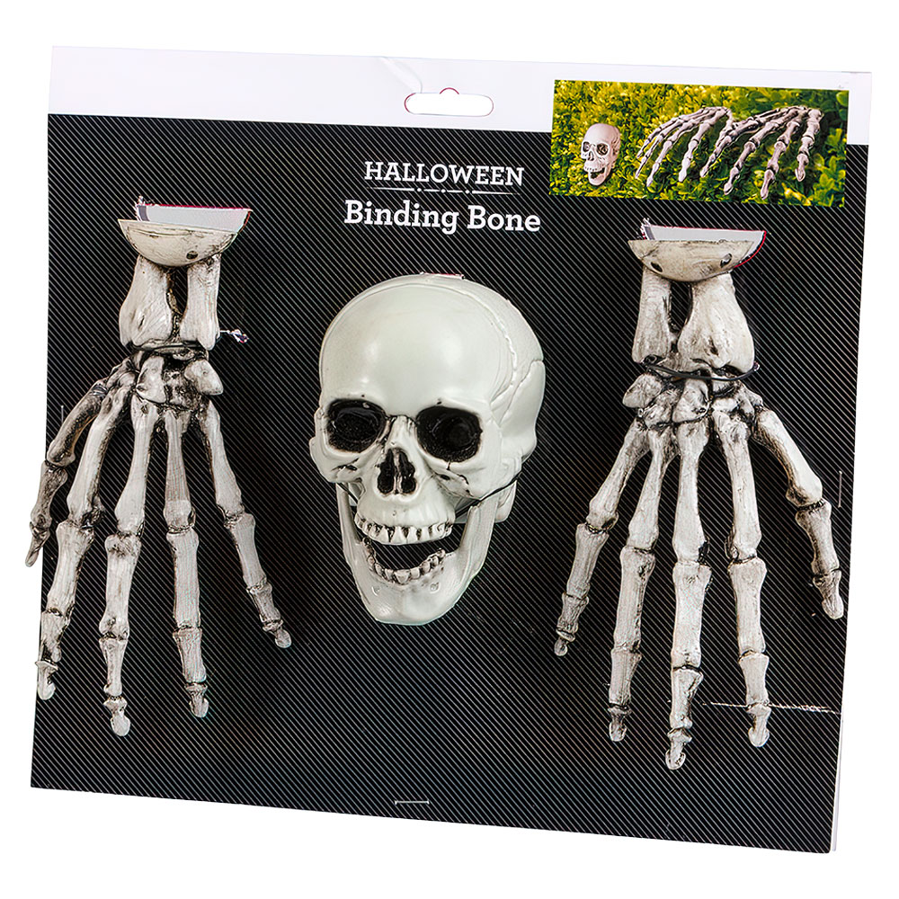 Döskalle och Skeletthänder Dekoration omfattar ett set med en dödskalle och ett par skeletthänder. Settet kommer med praktiskt ståltråd som gör det möjligt att fästa dem på flera olika saker som till exempel möbler eller dekorationer. Tillverkade av plast.