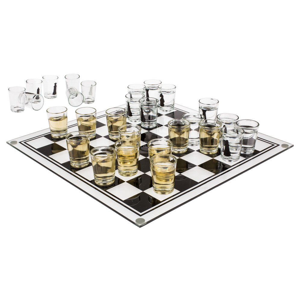 Drinkschack omfattar ett 35 x 35 cm stort schackbräde av glas samt 32 st shotglas med motiv av vita och svarta schackpjäser. Spelas som vanligt schack, men när din motståndare tar ut en av dina pjäser måste du dricka upp innehållet. Schackbrädet och shotglasen kan diskas i diskmaskin.