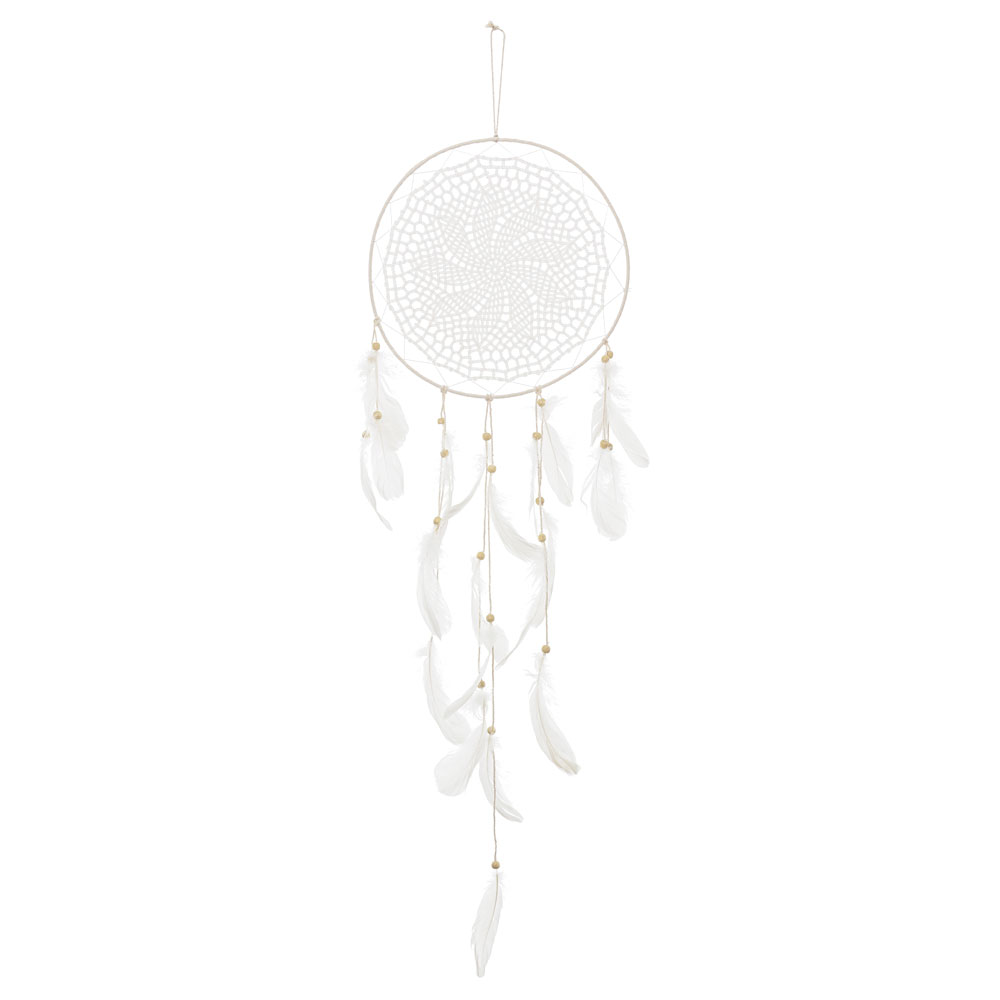Drömfångare Vit omfattar en vit drömfångare med vita fjädrar och träfärgade pärlor samt upphängningsögla. Drömfångaren mäter ca 30 cm i diameter och är ca 94 cm lång. Tillverkad av polyester och fjädrar.