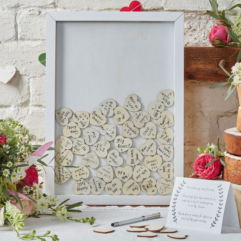 Denna gästbok ram är ett perfekt alternativ av gästbok för dig som inte vill använda dig av en vanlig gästbok. En riktigt fin och lite annorlunda gästbok ram i vitt med söta hjärtformade träbitar som gästerna kan skriva ett meddelande eller en lyckönskning på för att sedan lägga ner i ramen. En passande gästbok till exempelvis bröllop, dop, födelsedagar och andra liknande firanden.