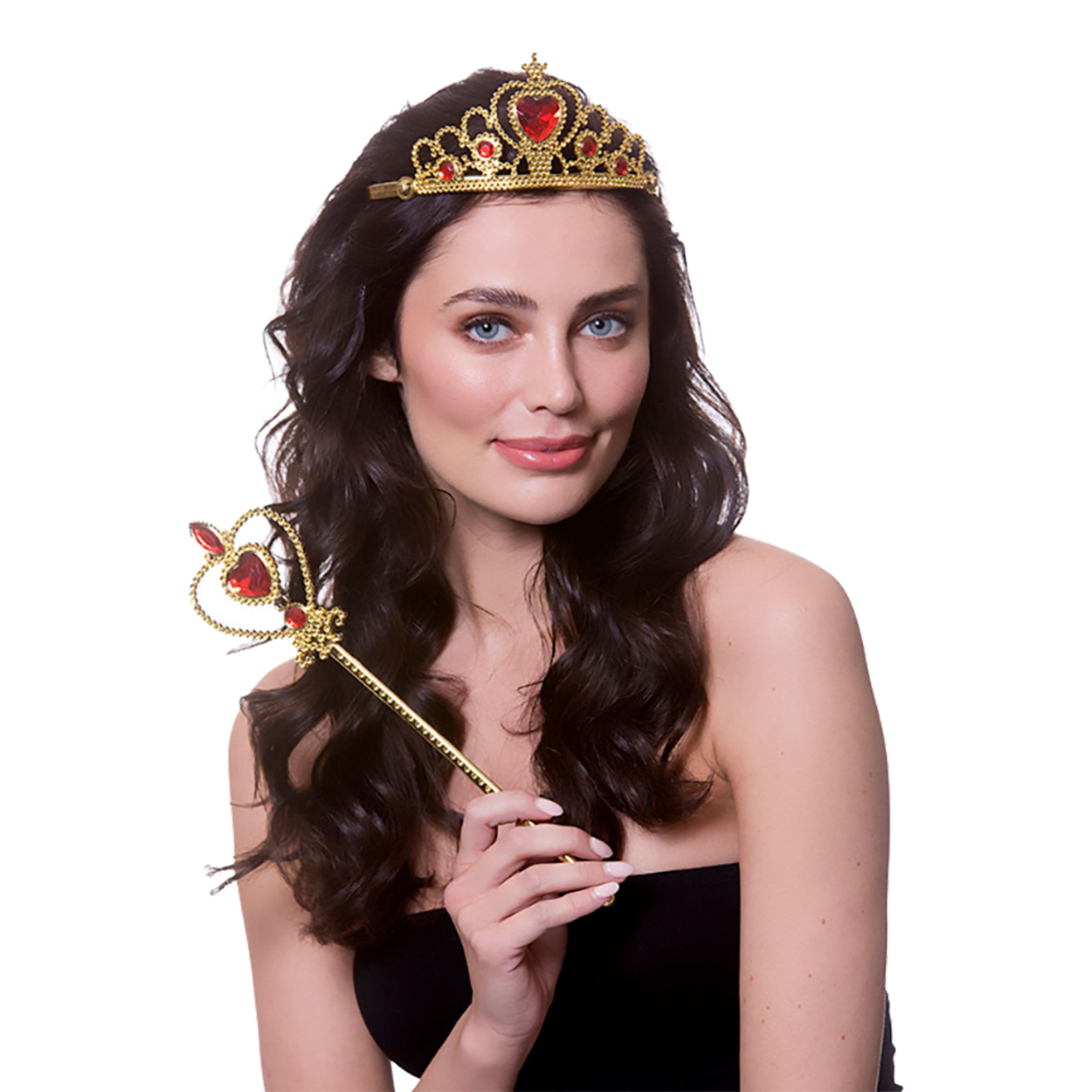 Drottningkrona & Stav Guld innehåller en guldig tiara med fina röda diamanter som dekoration. Kittet innehåller även en trollstav som matchar kronan perfekt!