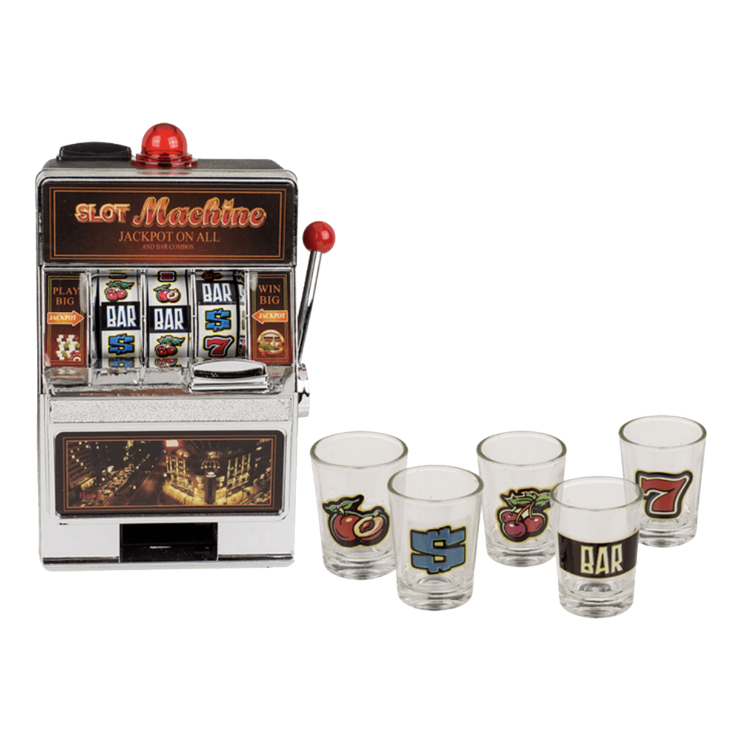 Dryckesspel Slotmaskin inkluderar en slotmaskin, fem shotglas, spelregler och bruksanvisning. Dryckesspelet levereras i en presentförpackning.