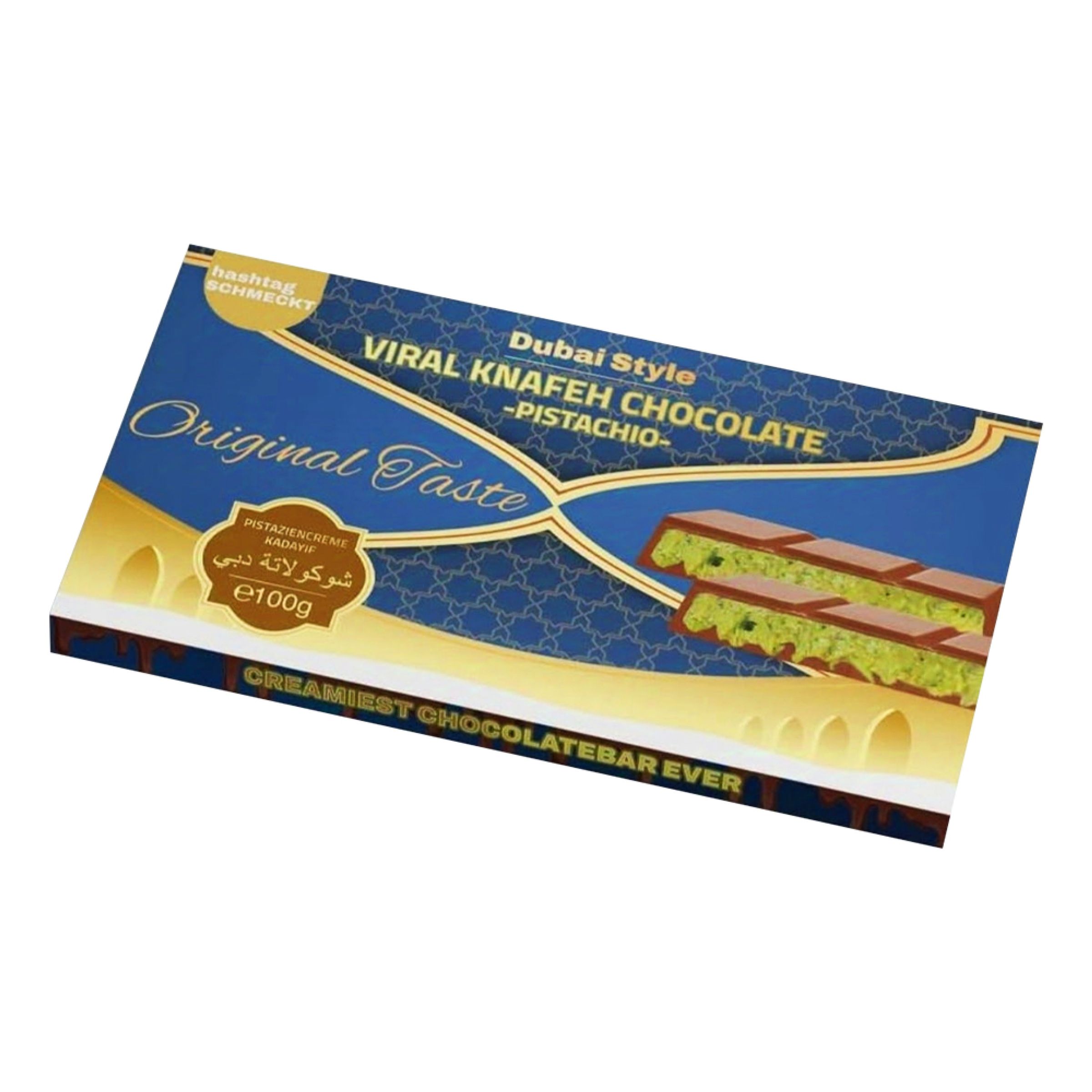 Dubai Style Knafeh Chocolate är en lyxig chokladkaka som kombinerar den arabiska desserten knafeh med len mjölkchoklad och krispiga delar av karamelliserad filodeg med pistagefyllning.
