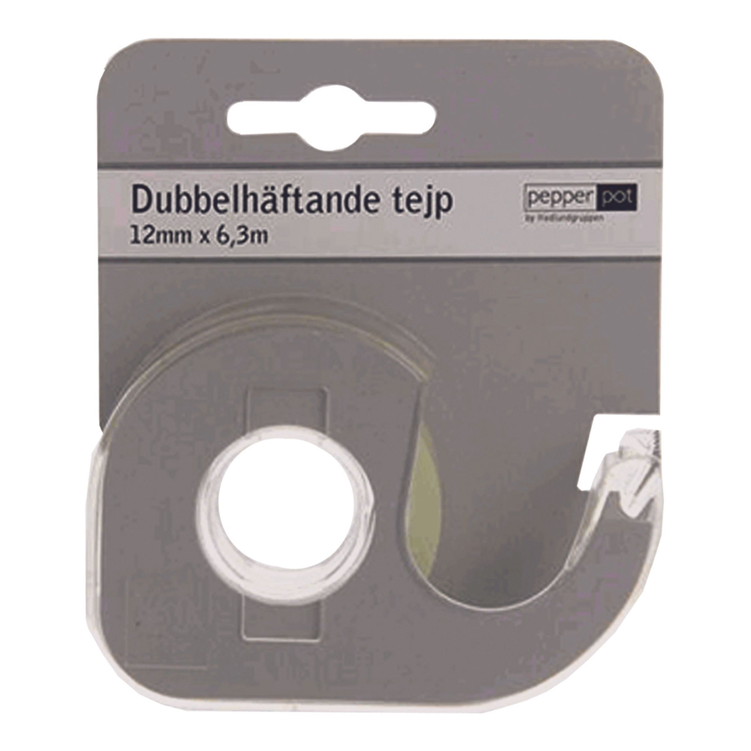 Dubbelhäftande Tejp på Hållare inkluderar en rulle med transparent och dubbelhäftande tejp. Tejpen är 1,2 x 630 cm stor och levereras på en hållare. Observera att tejpen kan skada ytskikt, till exempel om du tejpar på en tapetserad vägg.