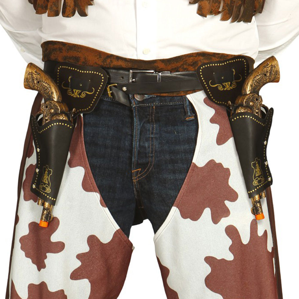 Detta set med två pistoler, två hölster och ett bälte för maskerad, Halloween och cowboy tema garanterar en snygg look. Hölstren sitter bekvämt på bältet, redo för äventyrliga dueller eller maskeraden.