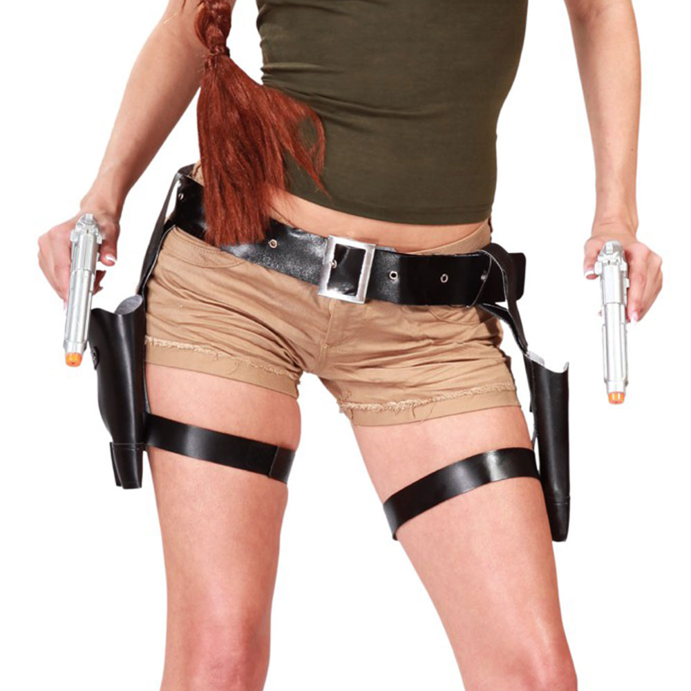 Dubbelt Hölster med Pistoler omfattar ett bälte med ett metallspänne med två hölster i svart fuskläder som fästs runt benen. Medföljer två stycken silverfärgade leksakspistoler.