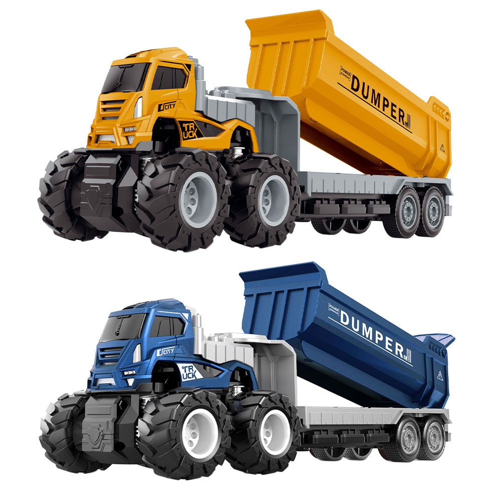 Dumper Leksak Fordon omfattar en billeksak i form av ett arbetsfordon med släp i formgjuten metall och plast med en pull-back motor, där man kan dra tillbaka fordonet så den sedan åker framåt. Leksaken finns i färgerna gul eller blå, vilken du får blir en överraskning. Dumperns släp går att tippa.