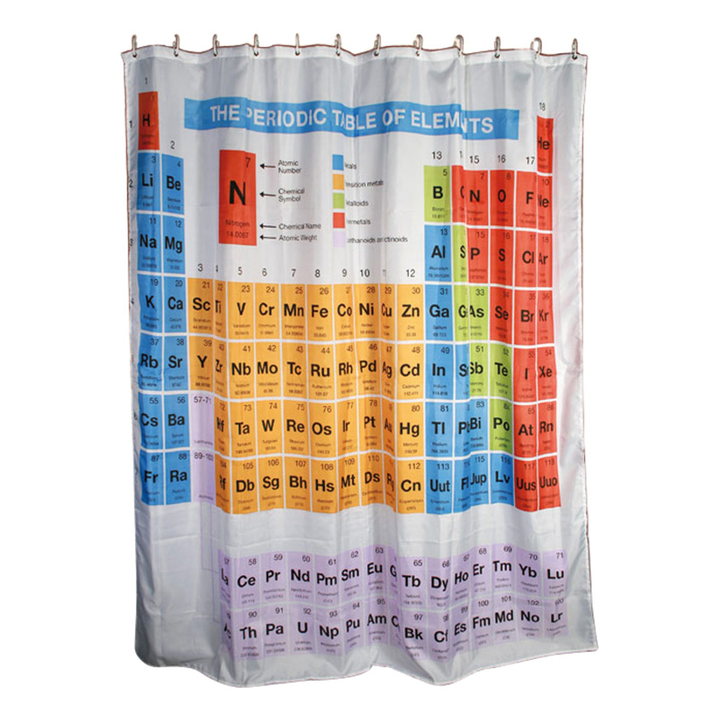 Äntligen kan du öva på jordens alla grundämnen samtidigt som du duschar på väg till skolan… Snyggt duschdraperi med periodiska systemet tryckt på framsidan av draperiet. Duschdraperiet är tillverkati 100% Polyester vilket gör att det tål vatten och fukt i badrummet och håller sig fräscht. Duschdraperiet mäter 180×180 cm.
