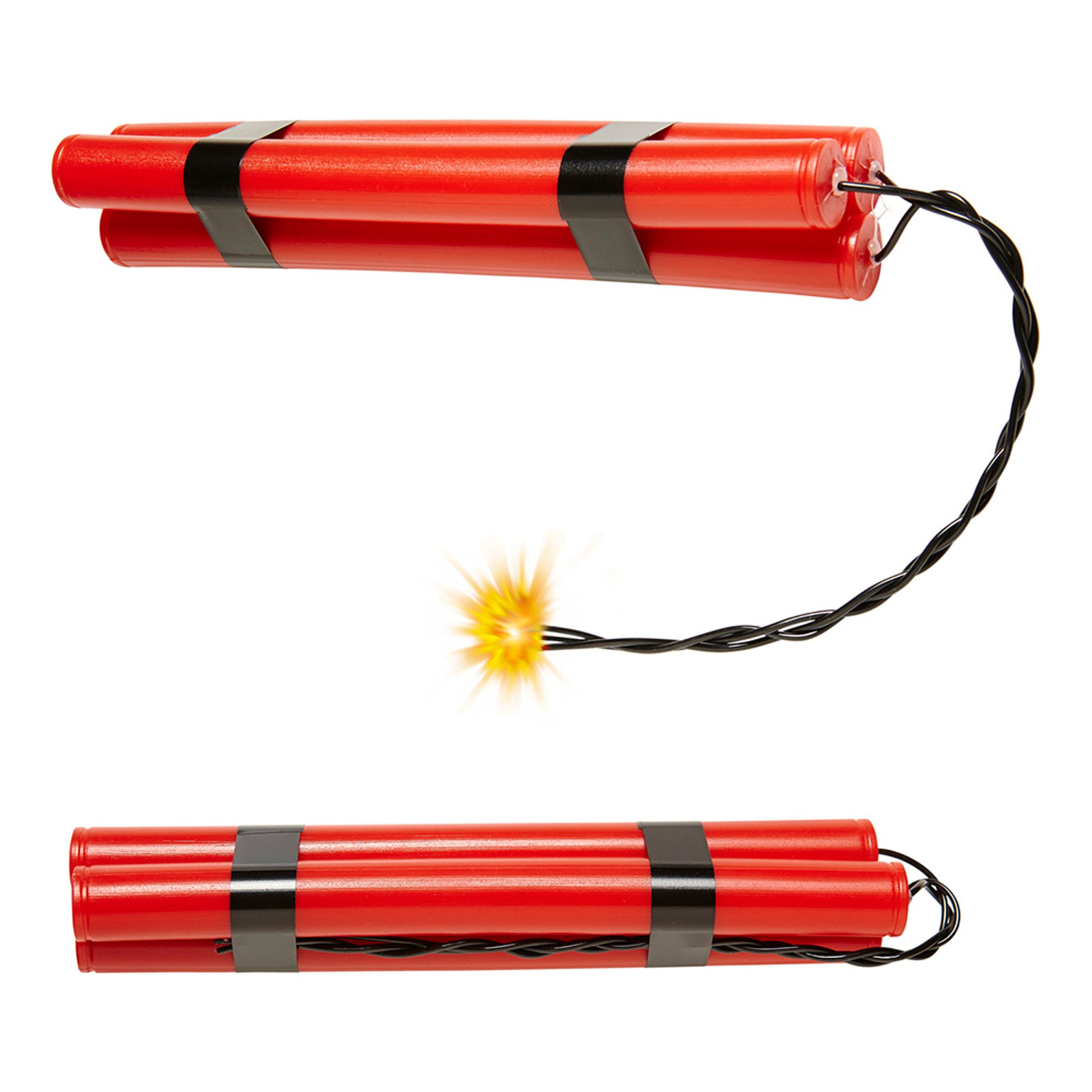 Realistisk dynamitgubbe bestående av tre stycken plasttuber med förslutna ändar som sedan sitter ihop med svart tejp med svart trådad stubin. Fungerar även bra att dekorera med till maskeradfesten.