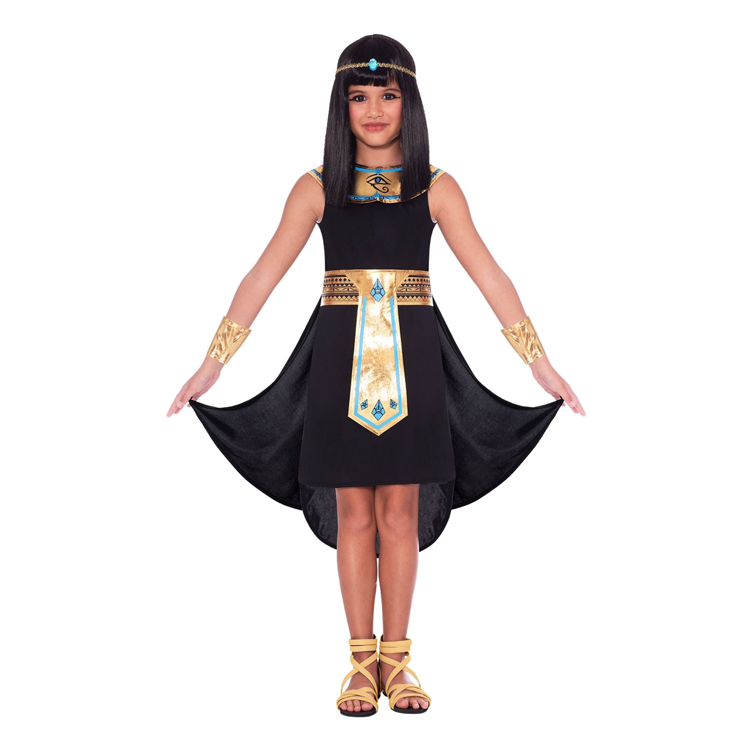 Egyptisk Farao Barn Maskeraddräkt finns i storlekarna Small, Medium, Large och X-Large. Dräkten är tillverkad i polyester och kommer komplett med klänning, armband, halsband, bälte och huvudsmycke. Rolig och fin dräkt att bära på halloweenfester och maskeradkalas!