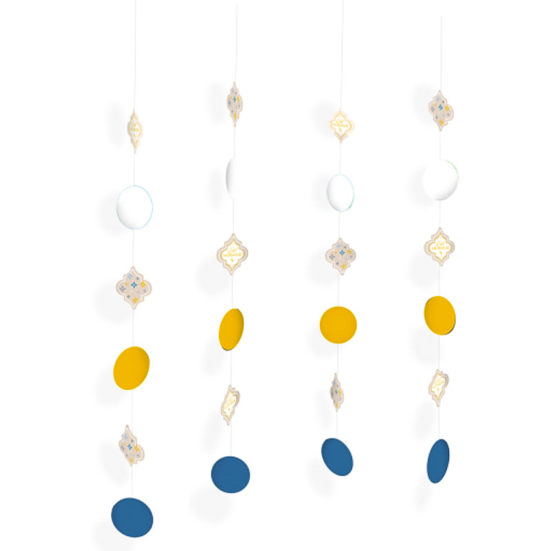 Eid Mubarak Hängande Dekorationer omfattar fyra stycken hängande dekorationer med omväxlande dekorationer med texten "Eid Mubarak" och vita, blåa och guldiga cirklar. Dekorationerna är ca 13 cm stora och hänger i girlanger med en total längd på 130 cm.