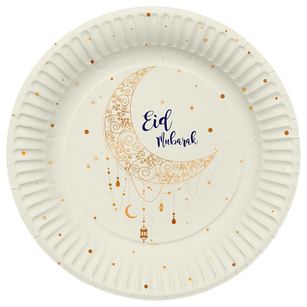 Fira Eid med stil och enkelhet genom att servera festmåltiden på våra dekorativa Eid Mubarak engångstallrikar av papper. Praktiska och estetiskt tilltalande, de skapar en minnesvärd atmosfär utan efterföljande disk. Idealiska för den heliga högtiden, våra papperstallrikar är en fest för både öga och själ.